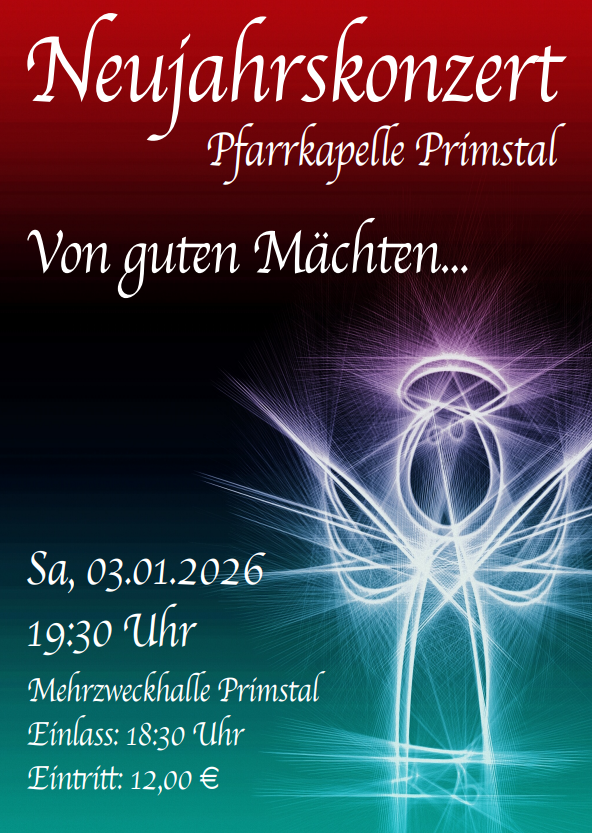 Unter dem Titel „Von guten Mächten“ lädt die Pfarrkapelle Primstal am 03. Januar 2026 zu ihrem Neujahrskonzert um 19:30 Uhr in die Mehrzweckhalle Primstal ein.